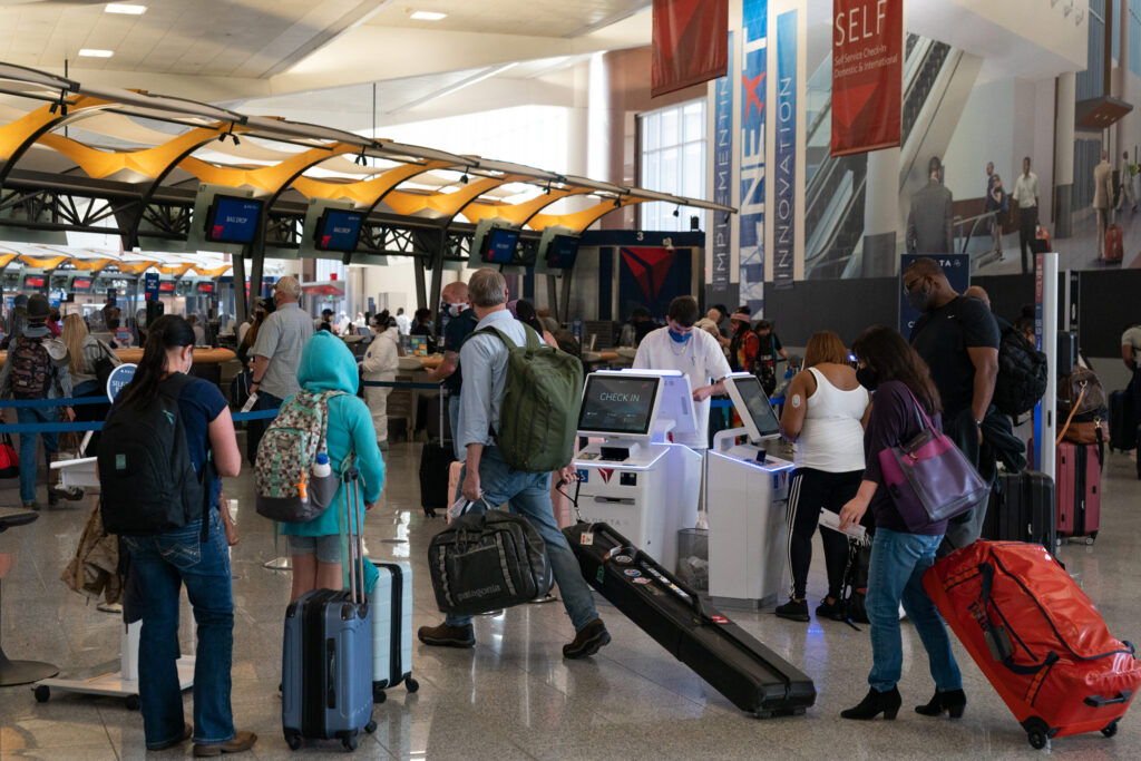 Passengers wearing protective masks check in and drop off luggage at the Delta Air Lines ticket counter at Hartsfield-Jackson Atlanta International Airport in Atlanta on April 7. (Bloomberg/Getty Images)